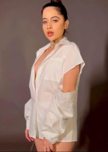 خاص بات یہ ہے کہ عرفی نے اس سفید کلر کی شرٹ کے آگے کے بٹن بھی کھول رہے ہیں ، جس میں ان کا کلیویج صاف نظر آرہا ہے ۔