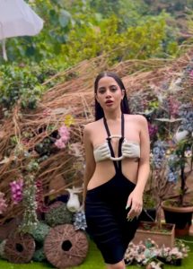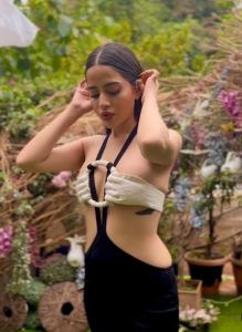 عرفی جاوید نے ایک سفید کلر کی عجیب و غریب برالیٹ پہن رکھی ہے ۔ اس برالیٹ کو فرنٹ سے ہاتھ کا ڈیزائن دیا گیا ہے ، جو دیکھنے میں کافی عجیب و غریب لگ رہا ہے ۔ اس کے ساتھ اداکارہ نے نیچے بلیک کلر کی اسکرٹ پہن رکھی ہے۔