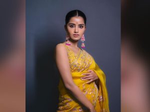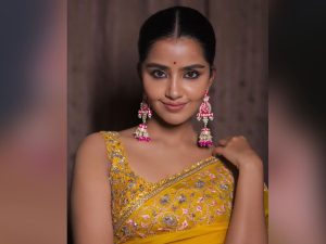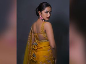 ڈیزائنر مسٹرڈ ساڑی اور بیک لیس کٹ سلیو بلاوز میں انوپما قاتلانہ انداز میں دکھ رہی ہیں ۔