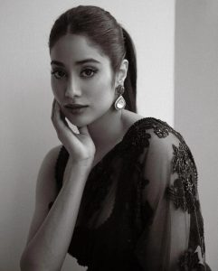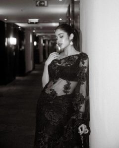 تصاویر میں دیکھا جاسکتا ہے کہ جھانوی نے بلیک کلر کی ساڑی پہن رکھی ہے ۔ اس ٹرانسپیرنٹ ساڑی میں جھانوی کا ڈیپ نیک بلاوز ان کو کافی ہاٹ بنا رہا ہے ۔