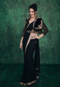 خوبصورت کالی ساڑی پر سلور ورک کا کام کافی جازب نظر ہے ۔ اس کے علاوہ ساڑی کے آنچل پر کیا گیا کام اس کے لک کو مارڈن بنا رہا ہے ۔