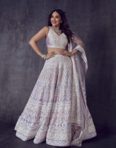 پرپل اور وہائٹ کلر کے اس تھریڈ ورک نیٹ لہگنے میں مادھوری دیکشت واقعتا سادگی کی مورتی نظر آرہی ہیں ۔ اس ڈریس کو مشہور ڈیزائنر منیش ملہوترا نے ڈیزائن کیا ہے ۔