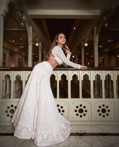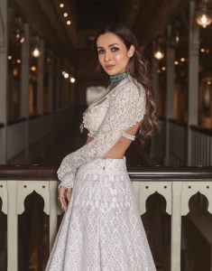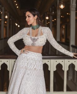 اداکارہ ملائیکہ اروڑہ نے اس خاص موقع پر سفید کلر کا انتخاب کیا ۔ ملائیکہ نے لہنگے کے اوپر اسی رنگ کی سفید چولی پہن رکھی ہے ۔