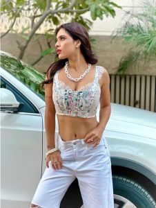 سفید کراپ ٹاپ نیہا ملک نے میچ کرتا ہوا وہائٹ ڈینم کیری کیا ہوا ہے ، جس میں وہ قہر ڈھارہی ہیں ۔