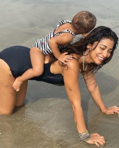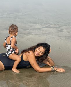 تصویروں میں اداکارہ اپنی پیاری سی لڑکی رادھا کو اپنی پیٹھ پر بیٹھائے بیچ پر لے جا رہی ہیں۔ جس میں اداکارہ کے چہرے پر خوشی دیکھنے کے لائق ہے۔