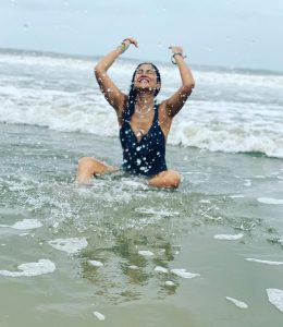 شریا شرن اس تصویر میں وہ سمندر میں پانی کے ساتھ انجوائے کرتی نظر آ رہی ہیں۔