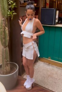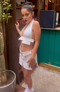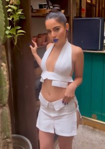 اداکارہ عرفی جاوید نے برا لیس ہو کر دو پٹیوں پر ٹکی ہوئی ٹاپ پہن رکھی ہے، جو آگے سے اوپن ہے ۔