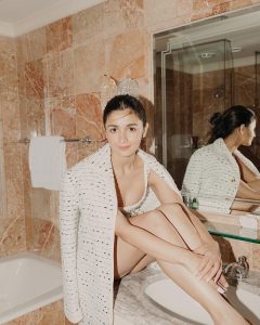 عالیہ بھٹ نے باتھ ٹب میں لیٹ کر فوٹو شوٹ کروایا ہے۔ وہائٹ گولڈن رنگ کی ون پیس ڈریس اور جیکٹ کے ساتھ ہائی لیول پہنے اداکارہ کا دلکش انداز دیکھتے ہی بن رہا ہے۔