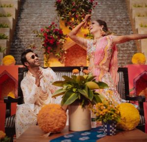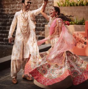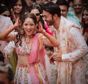 تصویر میں انکتا لوکھنڈے اور وکی گانوں پر ناچتے ہوئے نظر آرہے ہیں۔ دولہا اور دلہن نے رسم کے لئے میچنگ آوٹ فٹ کیری کیا تھا۔