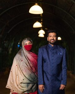 اپنے ولیمے پر شوہر کے ساتھ دلہن کے لباس میں چہرے کو حجاب سے ڈھکے نظر آئیں اے آر رحمان کی بیٹی خدیجہ