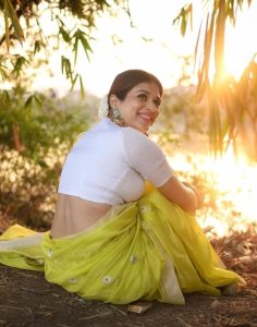 پیلی رنگ کی ساڑی اور سفید رنگ کے اونی بلاوز میں شردھا داس کھلکھلاتی ہوئی نظر آرہی ہیں۔