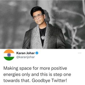 بالی ووڈ فلم ڈائریکٹر ۔ پروڈیوسر کرن جوہر نے سوشل میڈیا پر اعلان کیا ہے کہ انہوں نے ٹویٹر چھوڑ دیا ہے۔ جیسے ہی ڈائریکٹر نے اس کا اعلان کیا یہ بات سوشل میڈیا پر آگ کی طرح پھیل گئی ۔
