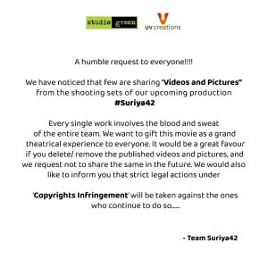 سوریہ اور دشا پٹانی نے ہدایت کار سریتھائی سیوا کی پین انڈیا فلم ‘سوریا 42’ (Suriya 42) سائن کی ہے، جس کا ٹائٹل آنا باقی ہے۔ فلم کی شوٹنگ گوا میں تیز رفتاری سے جاری ہے۔ اسی بیچ پروڈکشن ہاؤس اسٹوڈیو گرین نے سوشل میڈیا پر لیک ہونے والی تصاویر اور ویڈیوز کے حوالے سے بیان دیا ہے۔ فلم کے پروڈکشن ہاؤس نے مداحوں سے لیک ہونے والی تصاویر کو ہٹانے کی اپیل کی ہے اور ایسا نہ کرنے والوں کے خلاف قانونی کارروائی کا انتباہ بھی دیا ہے۔