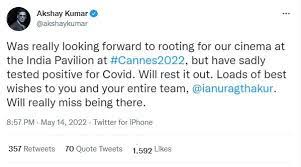 اکشے کمار نے ٹوئٹر پر بتایا ہے کہ وہ کورونا پازیٹیو ہو گئے ہیں جس کی وجہ سے وہ فرانس میں ہونے والے کانز 2022 اور وہاں انڈین پویلین نہیں جا سکیں گے۔