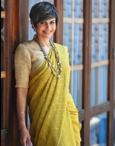 مندرا نے ہینڈلوم ساڑھی کے ساتھ کھادی فیبرک کا بلاؤز پہنا ہوا ہے اور انہوں نے بڑے موتیوں والا نیک پیس بھی پہنا ہوا ہے۔ مندرا کا یہ مکمل لک کافی انٹلیکچوئل لگتا ہے۔
