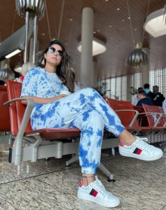 حنا خان بلیو اینڈ وہائٹ ٹریک سوڈ میں اسمارٹ لگ رہی ہیں ۔