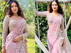 جیسمین بھسین پیسٹل لیوینڈر ساڑٰ میں بے حد خوبصورت لگ رہی ہیں۔