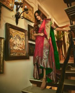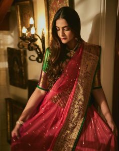 شیئر کی گئی تصاویر میں سونم کپور سلک کی ساڑھی میں نظر آرہی ہیں، جسے انہوں نے لہنگا کی طرح بنایا ہے۔