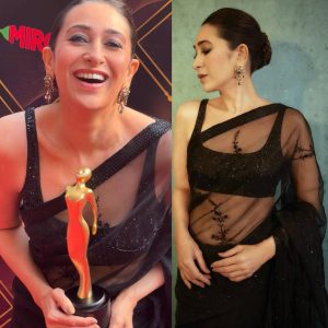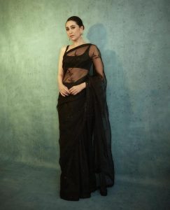 کرشمہ کپور نے انسٹا گرام پر جو تصاویر شیئر کی ہیں، اس میں انہیں بلیک کلر (سیاہ رنگ) کی نیٹ والی ساڑی میں دیکھا جاسکتا ہے۔ وہ اس میں اپنی دلکش ادائیں دکھا رہی ہیں۔