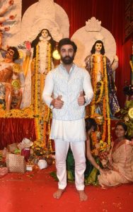 شارٹ کرتا، جیکٹ میں رنبیر کپور درگا پنڈال پہنچے، جہاں وہ پوز دیتے ہوئے بھی نظر آئے۔