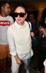 ایئر پورٹ کے باہر کرینہ آل وہائٹ لُک میں اسپاٹ کی گئیں۔ انہوں نے وہائٹ جاگرس کے ساتھ وہائٹ شرٹ اور وہائٹ سوئٹر پہنی تھی۔ ان کے جوتے بھی سفید ہی تھے۔