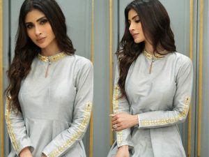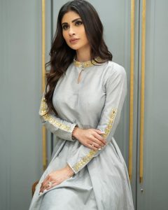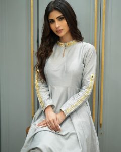 مونی گرے انارکلی سوٹ میں سادہ لیکن خوبصورت لگ رہی ہیں۔ اداکارہ کھلے بالوں اور نیوڈ میک اپ میں بہت پیاری لگ رہی ہیں۔