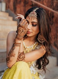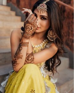 مونی رائے سیڑھیوں پر بیٹھ کر اپنی مہندی رچے ہاتھوں کو دکھا رہی ہیں ۔ کہنی تک رچی مہندی والے ہاتھوں کی تصویر میں مونی کی ادائیں دیکھ کر فینس ان کی تعریف میں جٹ گئے ہیں ۔