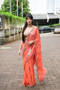 نورا فتیحی نارنگی رنگ کی چمچماتی ساڑی میں کافی خوبصورت لگ رہی تھیں ۔