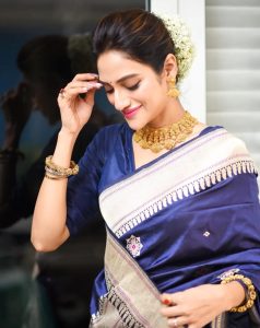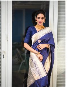 گرے بارڈر اور نیلے رنگ کی سلک ساڑی کے رائل لُک میں نصرت جہاں ایک دیسی ناری کی خوبصورتی کو بیان کر رہی ہیں۔