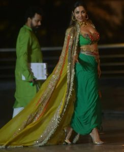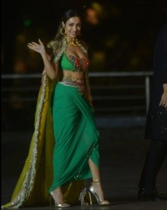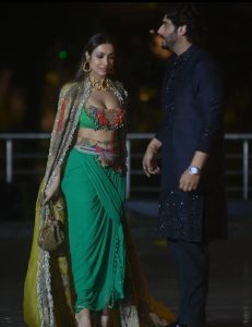 ملائیکہ کے لک کی بات کریں تو انہوں نے گرین کلر کا آوٹ فٹ پہن رکھا تھا ۔ انہوں نے ڈیپ نیک بلاوز کے ساتھ سلٹ والی اسکرٹ پہن رکھی تھی ۔