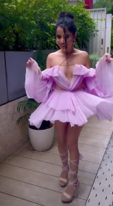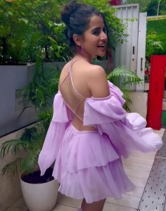 اداکارہ عرفی جاوید پرپل کلر کی ڈریس میں نظر آرہی ہیں ۔ ایسا معلوم ہوتا ہے کہ انہوں نے پرپل کلر کی شارٹ اسکرٹ پہن رکھی ہے اور اوپر ٹاپ کی جگہ کپڑے کو لپیٹ رکھا ہے اور اس سے فرنٹ سائیڈ کی باڈی کو کوور کر رکھا ہے ۔