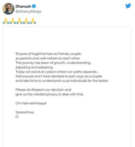 ساؤتھ کے سپر اسٹار دھنش (Dhanush) نے آج بڑا اعلان کرکے سب کو حیران کردیا ہے۔ دھنش نے اپنی اہلیہ ایشوریا (Aishwarya) سے علاحدگی کا اعلان کر دیا ہے اور اس اعلان سے فینس حیران ہیں ۔ بتادیں کہ ایشوریا سپر اسٹار رجنی کانت (Rajinikanth) کی بیٹی ہیں ۔ دھنش نے علاحدگی کا اعلان کرتے ہوئے نے لکھا کہ 18 سال کا ساتھ رہا ، جس میں ہم دوست، کپل اور والدین بن کر ساتھ رہے ۔ اس سفر میں ہم نے کافی کچھ دیکھا ۔ آج ہماری راہیں جدا ہو رہی ہیں ۔ ایشوریا اور میں اب ایک کپل کے طور پر الگ ہو رہے ہیں ۔ برائے کرم ہمارے فیصلے کا احترام کریں اور ہمیں پرائیویسی دیں ۔