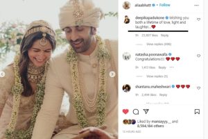 شادی کے بندھن میں بندھنے کے بعد عالیہ بھٹ نے رنبیر کپور کے ساتھ اپنی نئی شروعات کی کچھ تصاویر مداحوں کے ساتھ شیئر کیں۔ جیسے ہی انہوں نے اس پوسٹ کو سوشل میڈیا پر شیئر کیا، لوگوں نے بالی ووڈ کی اس جوڑی کو مبارکباد دینا شروع کر دیا۔ دیپیکا پاڈوکون، کٹرینہ کیف سمیت کئی مشہور شخصیات نے بھہ عالیہ-رنبیر کو خوشگوار ازدواجی زندگی کی دعا دی۔