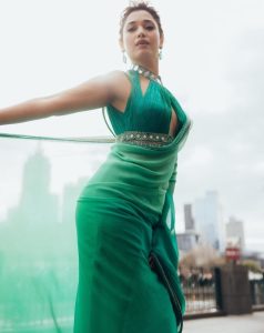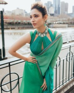 ہرے رنگ کی ساڑی میں تمنا بھاٹیہ کافی خوبصورت لگ رہی ہیں ۔
