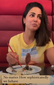 حنا خان نے حال ہی میں اپنے انسٹاگرام ہینڈل پر ایک ویڈیو شیئر کی ہے۔ اس میں وہ ریسٹورنٹ میں بیٹھی چاپ اسٹکس کے ساتھ اپنے کھانے سے لطف اندوز ہو رہی ہیں۔ ویڈیو میں، حنا کو پیلے رنگ کی ٹی شرٹ پہنے ایک آرام دہ انداز میں دیکھا جا سکتا ہے۔