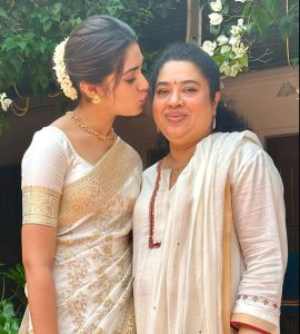 سوشل میڈیا پر منظر عام پر آنے والی تصاویر میں، کیرتی شیٹی کو ایک پرنٹ شدہ ساڑھی میں دیکھا جا سکتا ہے اور وہ ایک ہار، بالوں میں گجرا اور سرخ لپ اسٹک کے ساتھ اپنے لک کو مکمل کیا۔ اس میں ان کا سادہ سا لک دیکھنے کو مل رہا ہے۔