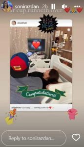 شادی کے دو مہینے بعد ہی بیٹی عالیہ بھٹ کے حاملہ ہونے کی خبر ملنے پر عالیہ کی ماں سونی رازدان نے انسٹاگرام اسٹوری پر دو پوسٹ کئے ہیں ۔ ان دونوں پوسٹ میں سونی رازدان نے عالیہ کے ماں بننے اور نیتو کپور کے جلد دادی بننے پر مبارکباد دی ہے ۔