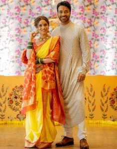 انکتا لوکھنڈے نے لال پیلی ساڑھی، ہاتھوں میں سبز چوڑیاں، ناک میں نتھ اور بالوں میں سفید پھولوں کے گجرے کے ساتھ نوواری ساڑحی میں مداحوں کا دل لوٹ لیا۔