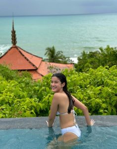 شنایا کپور نے مالدیپ میں سوئمنگ پول میں بکنی پہن کر بولڈ پوز دیا ہے ۔ اس میں انہیں سفید کلر کی ٹوپیس بکنی میں دیکھا جاکستا ہے ۔ تصویر میں ان کا سلم اور ٹونڈ فیگر بھی نظر آرہا ہے ۔