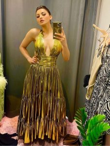 پلنجنگ نیک لائن کے ساتھ میٹیلک گرین ڈریس میں اروشی روتیلا کافی خوبصورت لگ رہی ہیں ۔