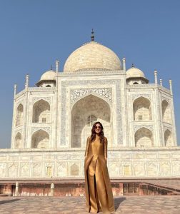 یامی گوتم نے تاج محل کے دیدار کے دوران فلور لینتھ گولڈ کلر کا آوٹ فٹ پہنا ہوا تھا۔
